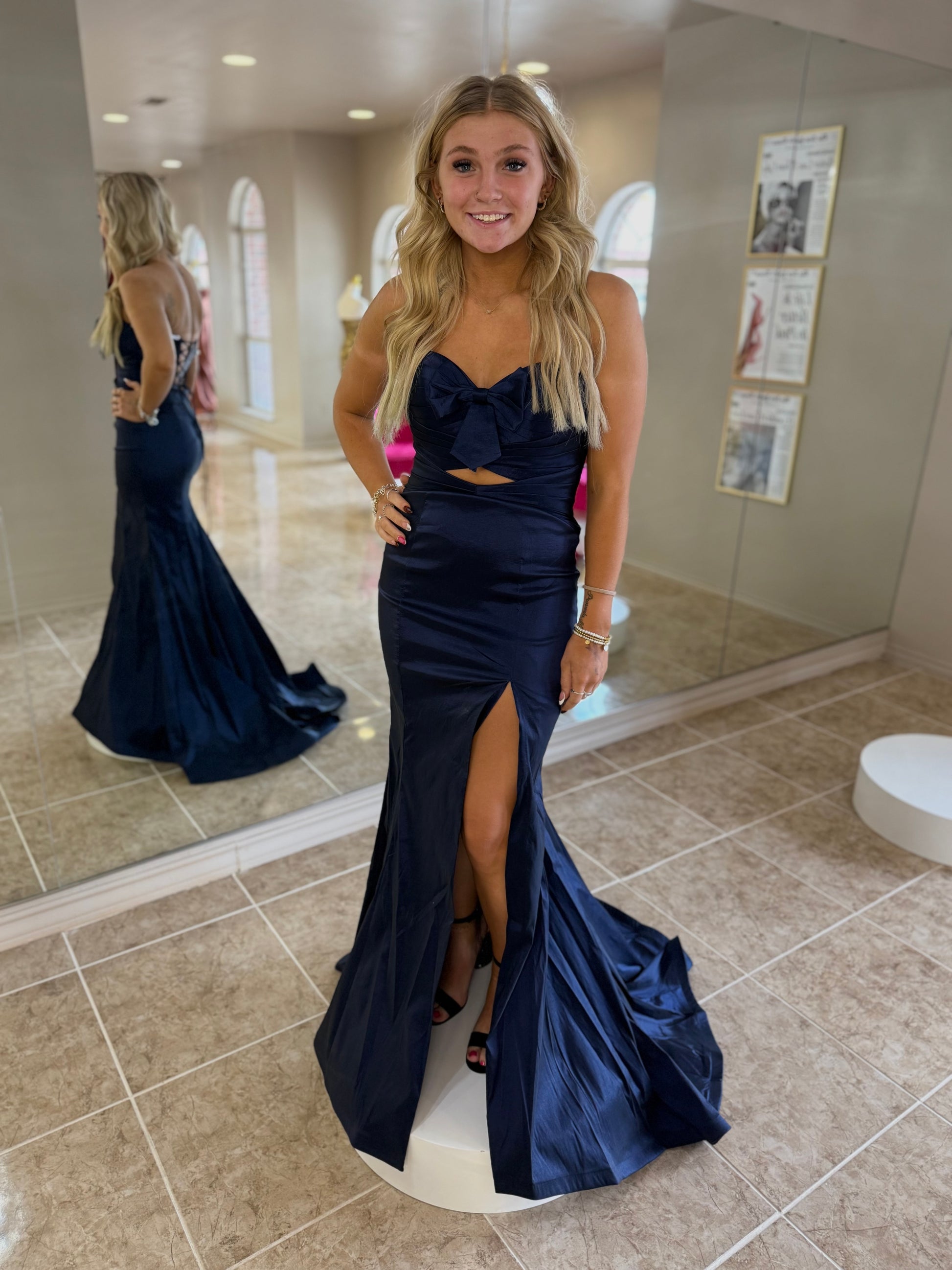 Strapless taffeta mermaid gown with keyhole and bow detail