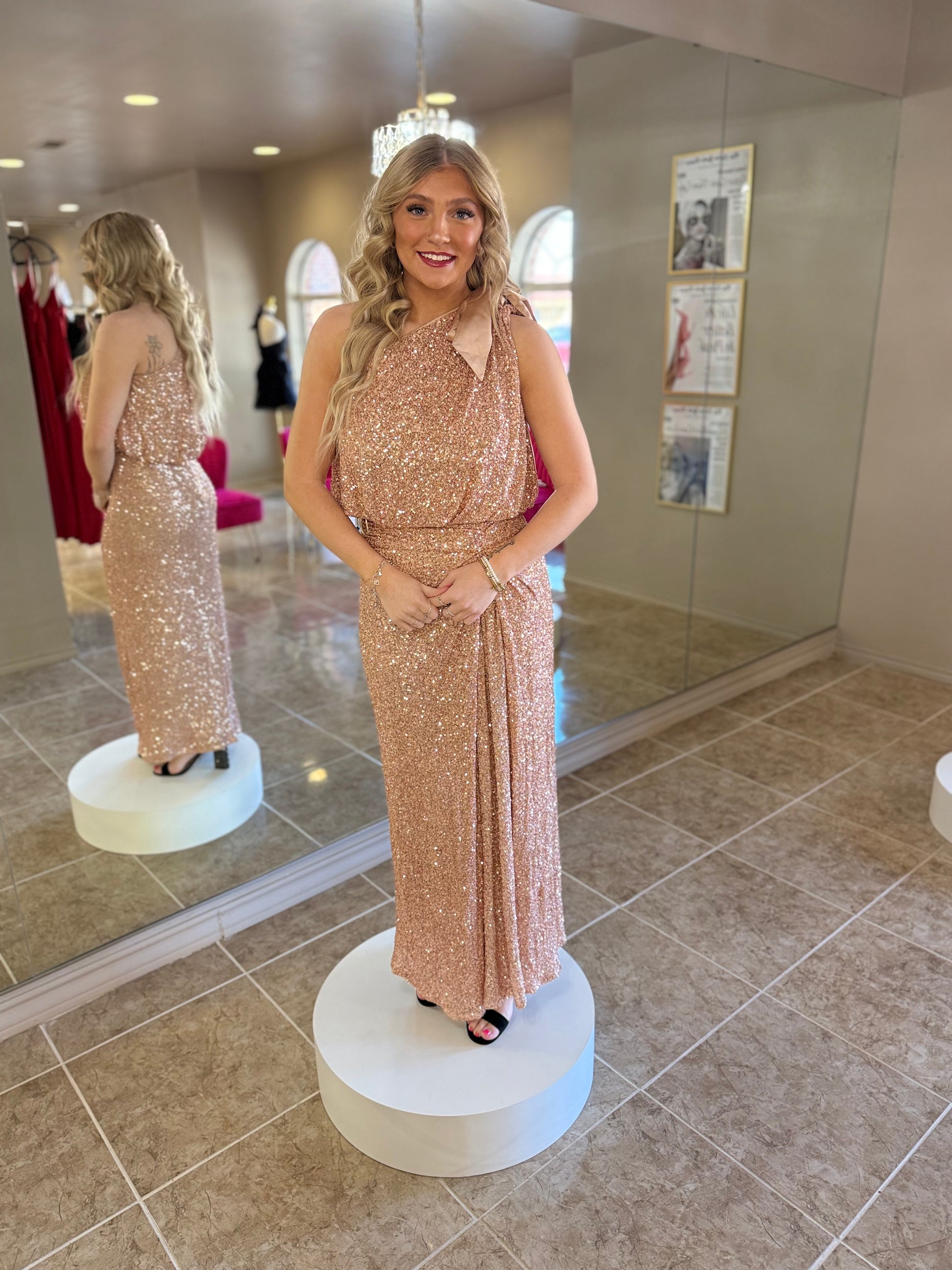 One shoulder tank with bow top and sequin maxi skirt set
