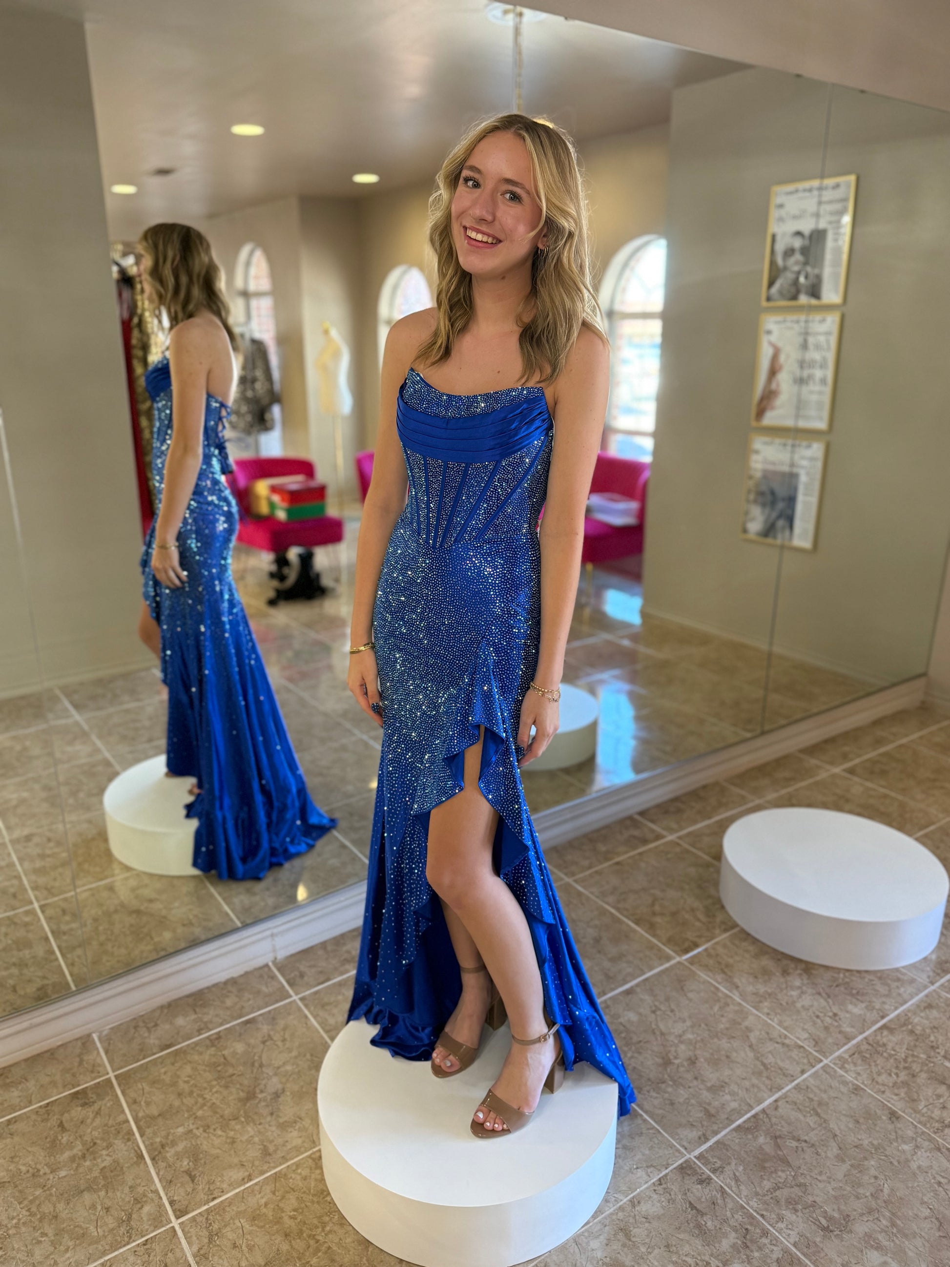 Strapless hot fix gown with corset bodice and ruffle skirt hem with slit